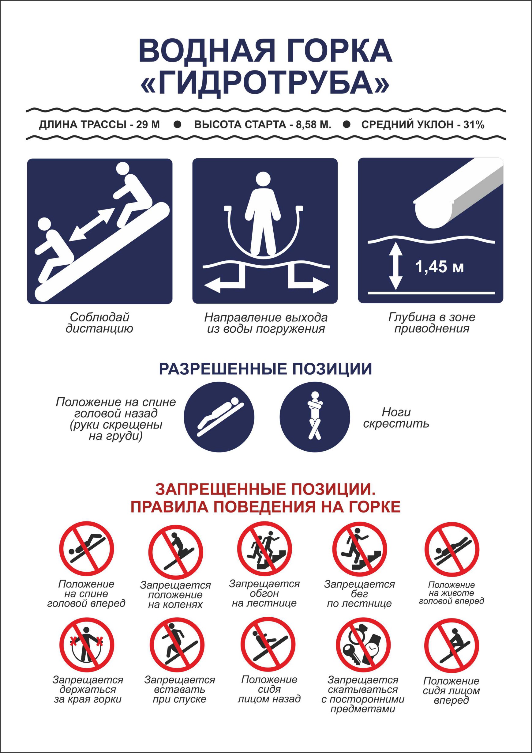 6.17. Запрещается спускаться с водных аттракционов стоя, лежа на животе и головой вперед. Посетитель обязан начинать спуск с положения, рекомендуемого инструктором и/или обозначенного на пиктограмме аттракциона. Посетитель обязан сохранять стартовое положение до момента приводнения.